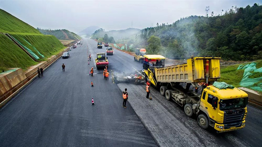 2019年8月,宜春經(jīng)開區(qū)S311路面攤鋪現(xiàn)場(chǎng),工友們輔助路面兩側(cè)的分料、補(bǔ)窩等作業(yè)